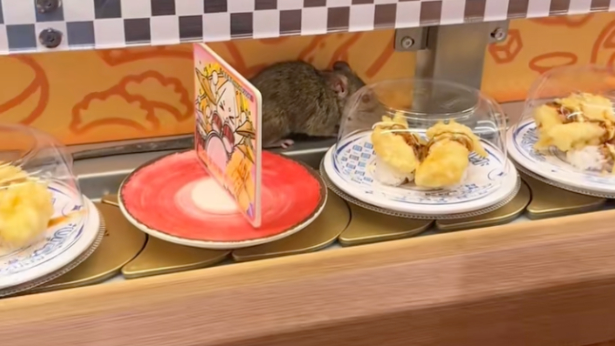 3月29日,中國網紅壽司品牌「金匠壽司」在杭州的一家分店,驚現一隻大老鼠在壽司迴轉台上來回奔跑,現場顧客炸鍋。