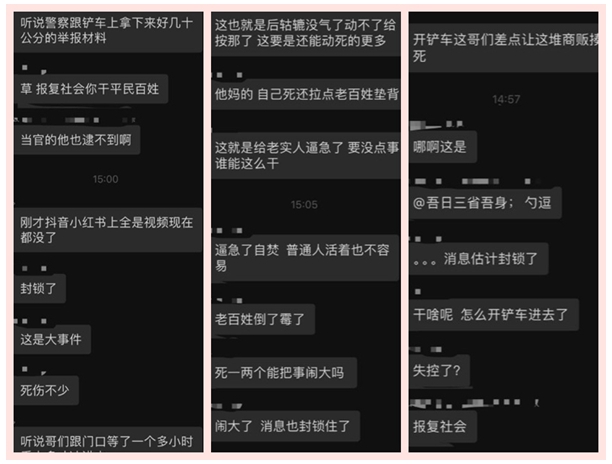 聊天記錄還說,「聽說警察跟(從)車上拿下來好幾十公分(厚)的舉報材料」「這就是給老實人逼急了,要沒點事誰能這麼幹」「剛才抖音小紅書上全是視頻,現在都沒了」「鬧大了,消息也封鎖住了」。
