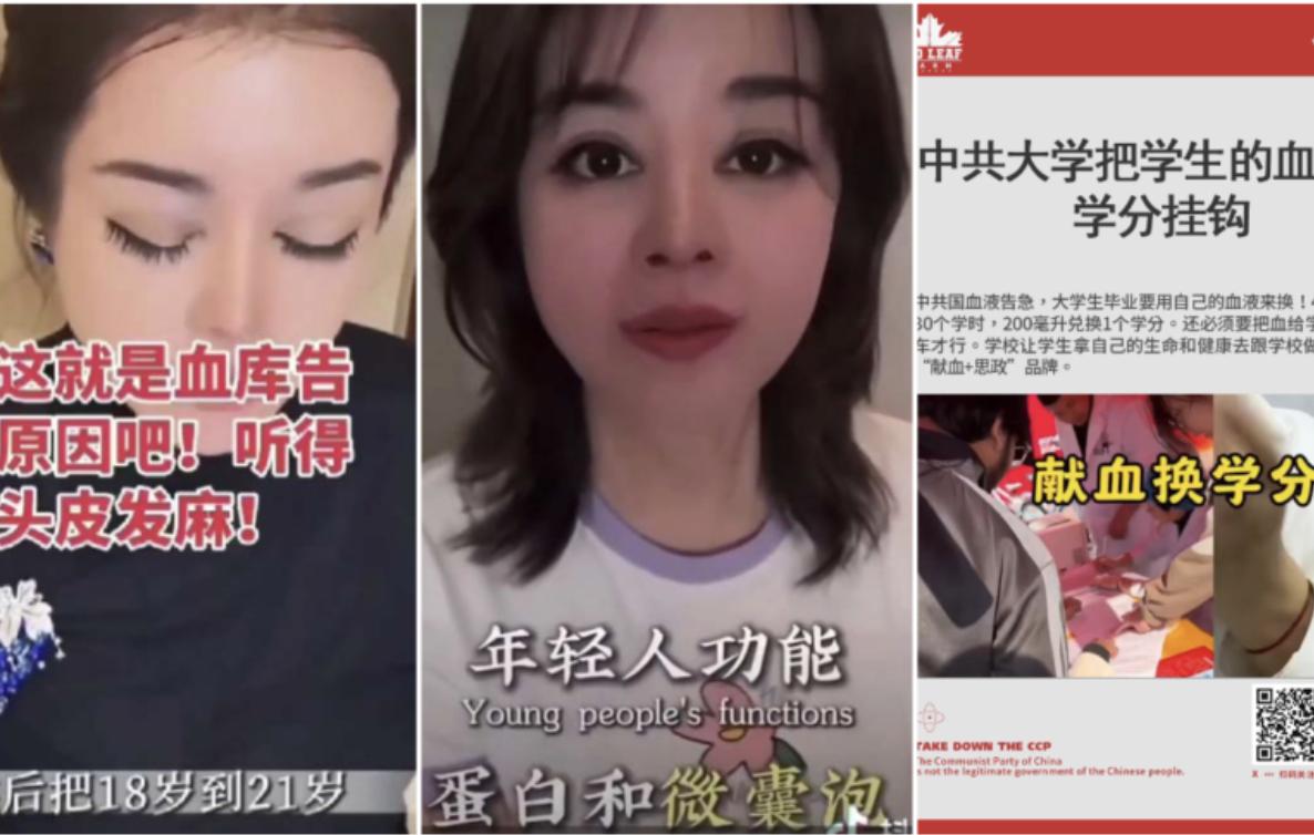 左圖和中圖:虞美人國際集團創始人於文紅宣傳用年輕人血液給富豪「恢復青春」。右圖:中共學校用各種手段逼迫學生獻血。(網路截圖合成)