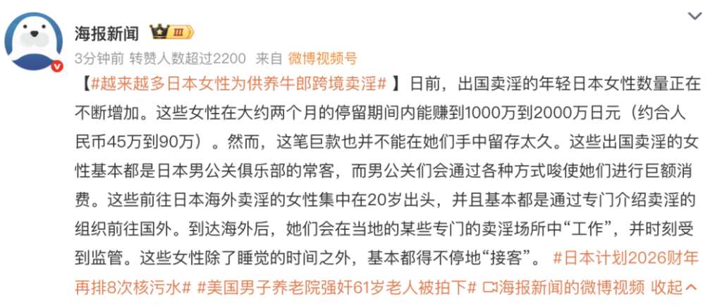 結果報道里,竟然描述成了一個成熟、穩定、大規模運轉的「跨境賣淫產業鏈」,主體還是「日本的普通年輕女性」,這符合正常社會、國家的生存邏輯嗎?把極端個例說成普遍情況,並且還誇張到「兩個月賺1000萬–2000萬日元」,即45萬到90萬人民幣……你們這是報道,還是招聘?