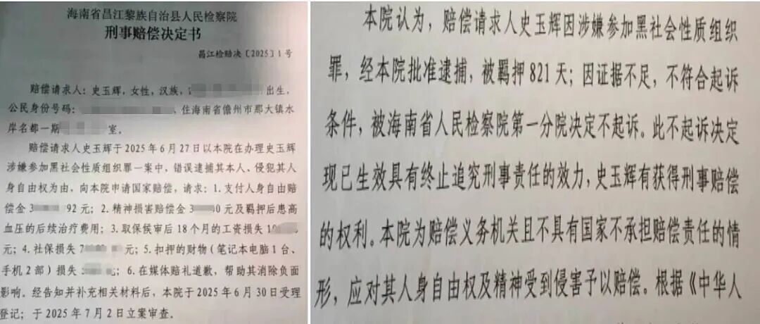 隨後史玉輝申請國家賠償,2025年8月29日,檢察院作出《刑事賠償決定書》,同意賠償史玉輝821天的人身自由賠償金,支付精神損害撫慰金,刪除案件信息,消除負面影響,並賠禮道歉。