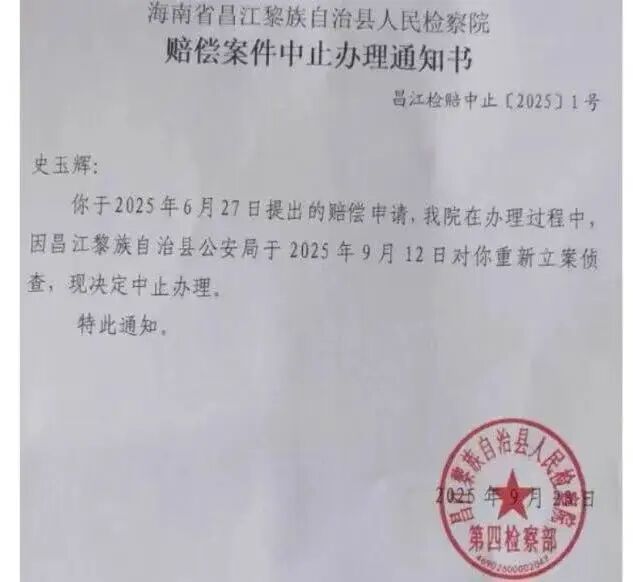 9月23日,昌江縣檢察院一紙《賠償案件中止辦理通知書》,賠償停了。