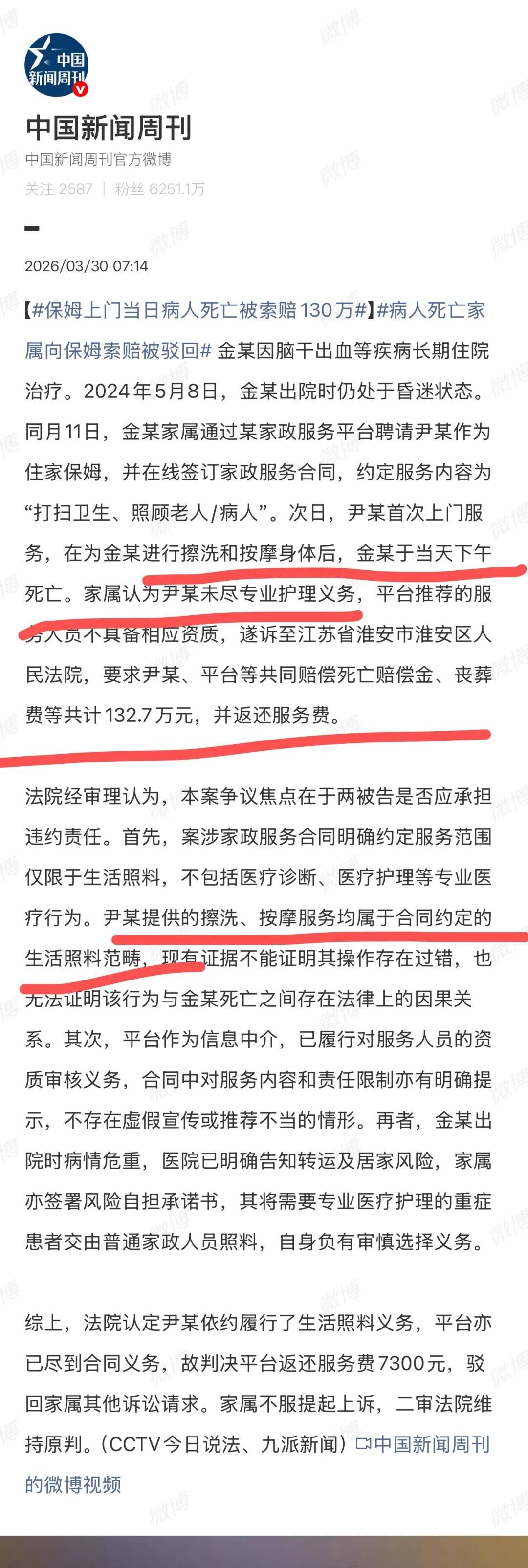 江蘇淮安一個腦幹出血的病人家屬在將病人接回家後,突發奇想在網上找了一個住家保姆,然後保姆上門第一天,這位病人就去世了,而後家屬的操作就是要求保姆和平台賠償死亡費和喪葬費,以及退回服務費!