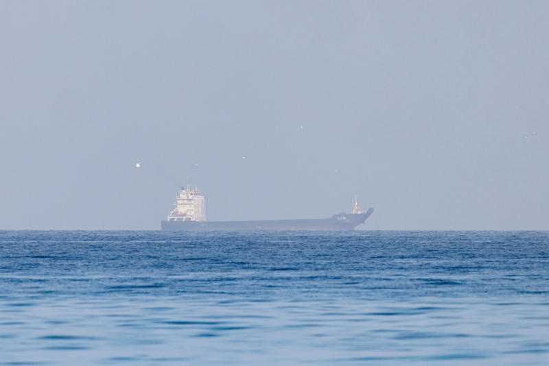 2026年3月22日,一艘貨船在霍爾木茲海峽附近的阿聯酋拉斯海馬北部海灣航行。(Getty Images)
