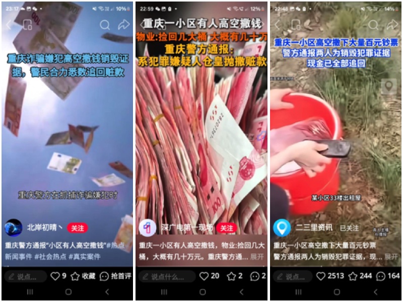 近日大陸重慶市九龍坡一個小區突然出現高空拋大量百元大鈔的奇景,在網上引起關注熱議,事後警方通告稱犯罪嫌疑人拋撒贓款所致。