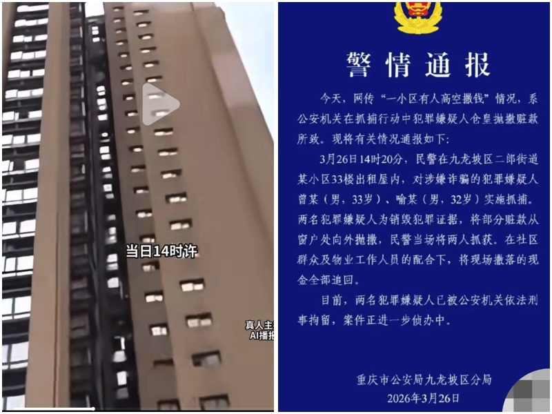 很快重慶市公安局九龍坡區分局發佈公告證實,稱「今天,網傳『一小區有人高空撒錢』情況,系公安機關在抓捕行動中犯罪嫌疑人倉皇拋撒贓款所致。」