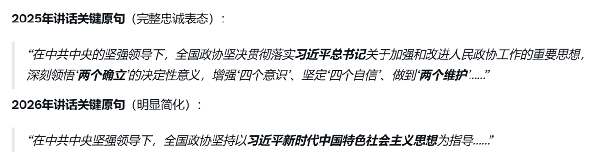 對比2025年3月25日講話,當時石泰峰明確提到「堅決貫徹落實習近平總書記關於加強和改進人民政協工作的重要思想」,並強調「兩個確立」「四個意識」「四個自信」「兩個維護」。而在2026年的講話中,這些直接指向個人忠誠的表態全部消失,轉向突出「黨中央集體領導」。這一微妙變化迅速引發海外關注。