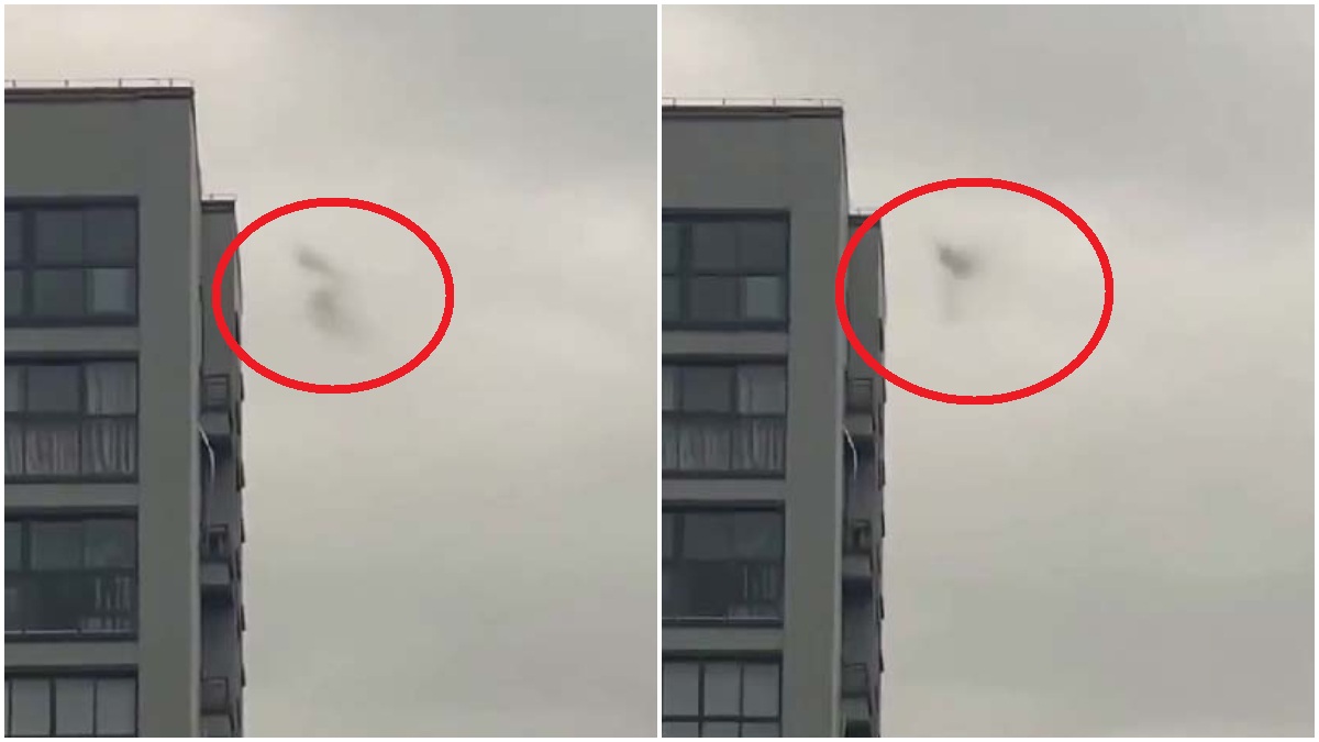 大陸網民拍到天空兩團神秘的黑影盤旋。(視頻截圖)