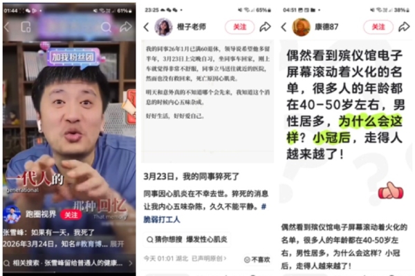 廣西的Yaya女士介紹,「我男同事這個月也猝亡了,才36歲。」上海的Icecat女士介紹,「同事3月14日離開的,也是突然走的,而且還是馬拉松愛好者,身體感覺平時還是挺好的。」
