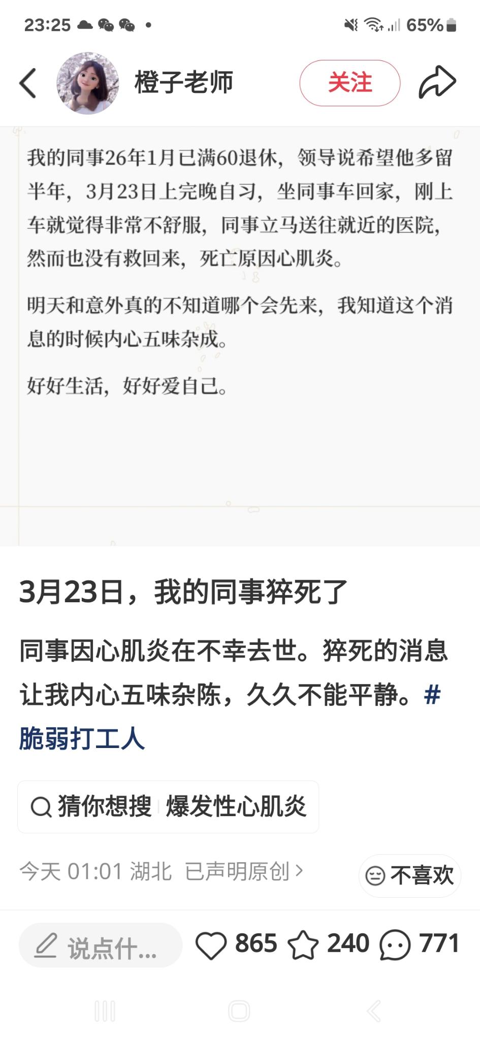 3月27日,湖北橙子老師發了一篇短文:「3月23日,我的同事跟張老師一樣猝亡了。」