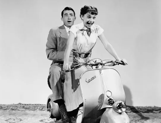 柯德莉·夏萍和格里高利·派克正在為1953年的愛情喜劇片《羅馬假日》排練摩托車戲份。