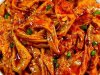 3.滑炒封條:鍋燒寬油,油溫五成熱(筷子放進去冒小泡)時,把封條片快速滑散,變色馬上撈出。這一步是封條脆嫩的關鍵,久了就老了。