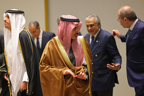 2026年3月19日,沙特阿拉伯外交大臣費薩爾·本·法爾漢·阿勒沙特(中)和卡塔爾外交大臣穆罕默德·本·阿卜杜勒拉赫曼·阿勒薩尼(左)在利雅德出席磋商部長級會議。阿拉伯和伊斯蘭國家的外長們齊聚一堂,討論該地區的安全危機。示意圖。(Fayez Nureldine/ AFP via Getty Images)