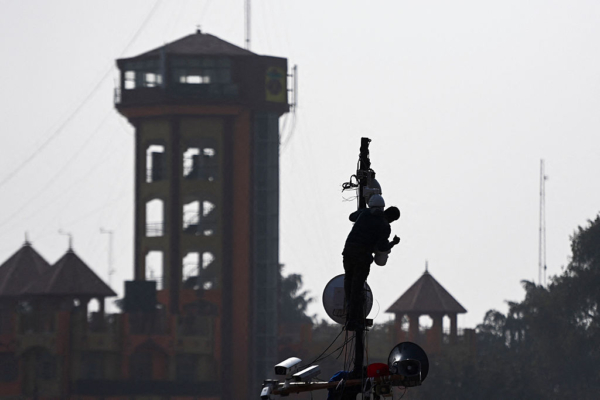 2021年1月13日,在印度哈里瓦,工人爬上路邊的電線杆,檢查攝像頭。(Money Sharma/AFP via Getty Images)
