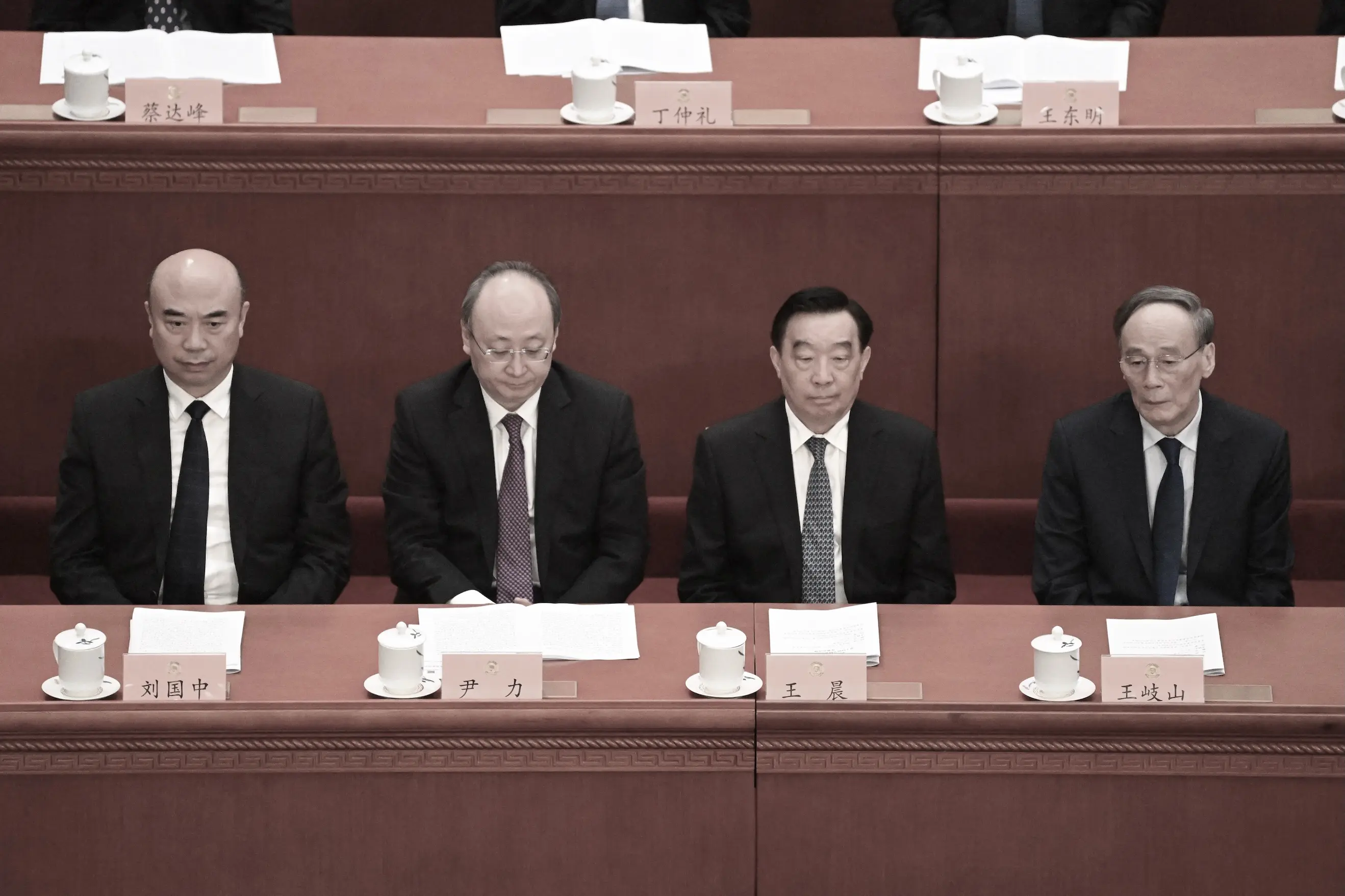 2023年3月4日,中共中央政治局委員劉國中(左一)、北京市委書記尹力(左二)、中共全國人大副委員長王晨(右二)和中共國家副主席王岐山(右一)在北京大會堂出席中國人民政治協商會議開幕式。(NOEL CELIS/AFP via Getty Images)