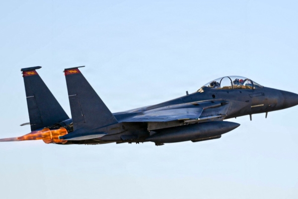 2026年3月16日,在「史詩之怒」(Operation Epic Fury)行動期間,一架美國空軍F-15E打擊鷹(F-15E Strike Eagle)從秘密地點起飛執行戰鬥任務。(美國空軍/法新社)