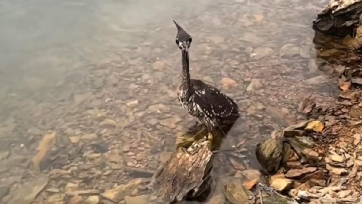 4月2日,浙江一位博主在社交媒體發視頻稱,其解救了一隻很兇,但不知名的野生小鳥。視頻顯示,一隻頭上有冠、嘴巴尖尖,黑色羽毛中夾雜着白色斑點的鳥被困在一水域淺灘處,細長的腿上疑被絲線纏住無法飛離。它發出嘶啞的「嘎、嘎、嘎」聲。不少網友說,這隻鳥是海南鳽。