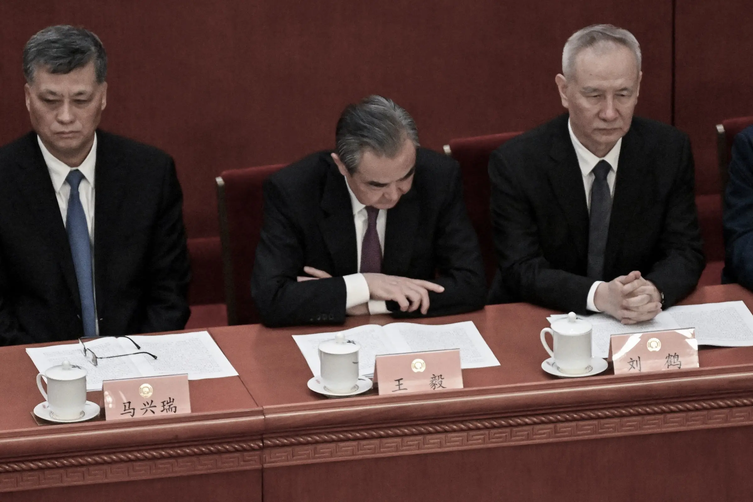 2023年3月4日,時任中共中央政治局委員馬興瑞、中央外事工作委員會辦公室主任王毅及時任中共國務院副總理劉鶴(從左至右)在北京大會堂出席全國政治協商會議開幕式。