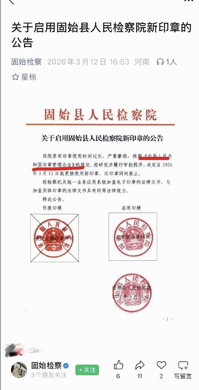 河南固始縣檢察院於上個月發佈「關於啟用固始縣檢察院新印章的公告」,公告中提及,原有印章使用時間過長,嚴重磨損,根據《中華人民共和國印章管理辦法》,經履行審批程序,決定在2026年3月11日起更管使用新印章,舊印章同時廢止。