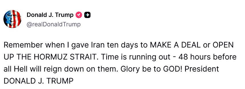 川普總統在平台上寫道:「還記得我曾經給伊朗十天時間,要麼達成協議,要麼開放霍爾木茲海峽嗎?時間不多了——48小時,之後他們將遭受地獄般的懲罰。榮耀歸於上帝!」