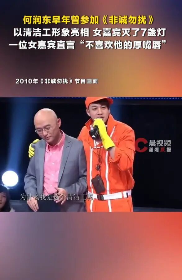 2010年,何潤東穿着一身清潔工的衣服上了《非誠勿擾》,一來是為了宣傳電視劇《無懈可擊之美女如雲》,二來也是衝着「徵婚」來的。何潤東在上台前還自信滿滿地和孟非打賭說:如果台上留燈20盞就讓孟非請他吃飯,如果低於20盞就請孟非。