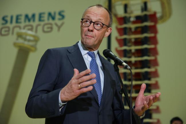 2026年2月26日,德國總理梅爾茨在參觀西門子能源時對媒體發表講話。(美聯社)