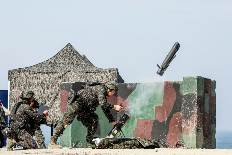 2026年1月29日,在台灣高雄左營基地舉行的演習中,士兵正在發射小型攻擊無人機。