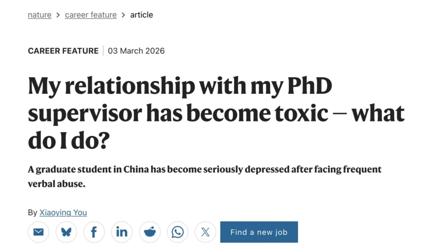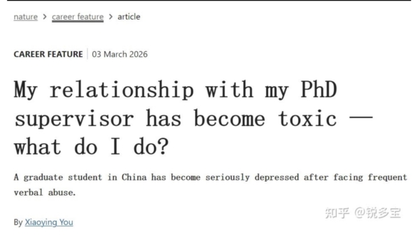 據上個月Nature網站的公開信息,這封信的作者名為「Xiaoying You」。信中說,她是一名在中國某高校就讀的環境科學與工程專業的博士二年級學生,之所以尋求建議,是因為她正處於危機之中,她擔心和導師的職業關係已經變得極其惡劣(toxic),且無法修復。她說她完全缺乏學術指導,她的研究提案總是被全盤否定,甚至遭受導師的極其嚴厲的指責,包括說她「無能」,「甚至不如一個碩士生」。