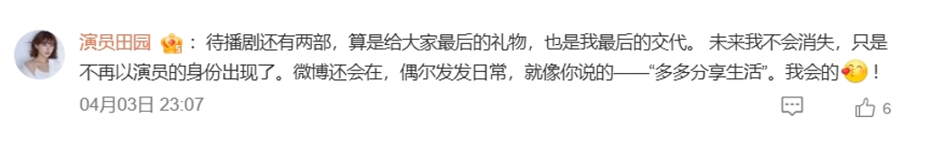 對於退圈決定,田園強調並非放棄表演,而是「因為太愛了」,不願讓這份熱愛被消磨殆盡,田園坦言: 「我選擇退圈。不是因為不愛演戲了。恰恰相反,是因為太愛了,愛到不願讓它蒙塵。與其在這個被流量和數據定義體系里一點點磨損掉初心,不如在它最完整的時候,親手把它封存起來。」