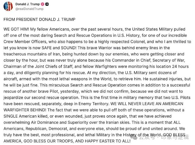 特朗普在聲明中強調:"這位勇敢的戰士從未真正孤立無援。我們絕不會拋下任何一名美國作戰人員!這是所有美國人,無論黨派,都應該感到自豪並團結一致的時刻。我們擁有世界上最優秀、最專業、最具殺傷力的軍隊。"復活節之際,這份平安喜訊,為無數美國家庭帶來溫暖與驕傲,也在全球範圍內重申了美國對盟友和自身軍人的承諾。
