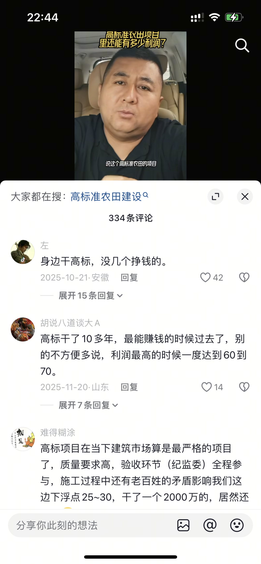◉抖音用戶@紅光聊工程對高標準農業建設的發言引來眾多同行吐苦水。