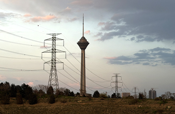 2026年4月4日的照片顯示了德黑蘭日落時分的輸電塔和米拉德塔。(ATTA KENARE/ AFP via Getty Images)/