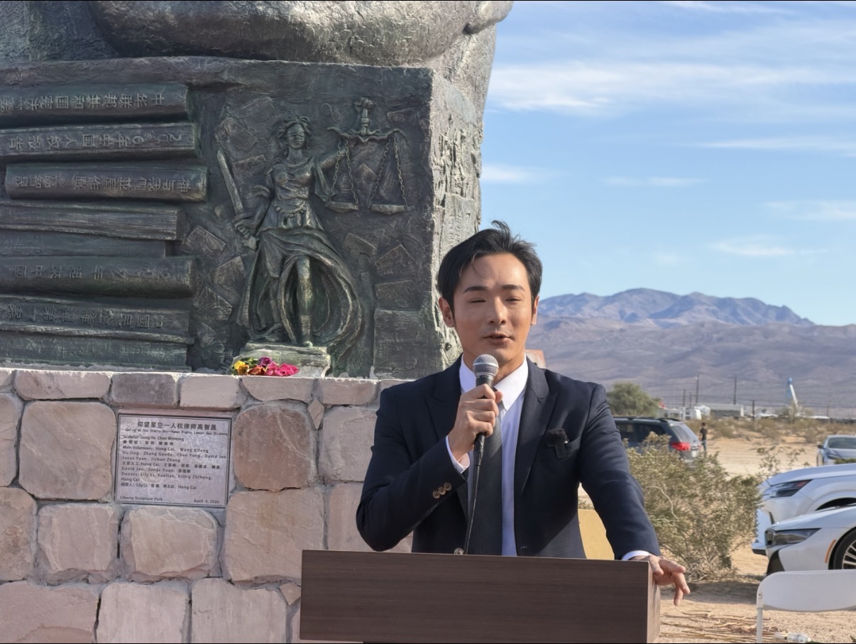 2026年4月4日,二百多位嘉賓雲集南加州自由雕塑公園,出席中國人權律師高智晟塑像揭幕儀式。前中國人權律師游飛翥發言。(陳德怡/大紀元)