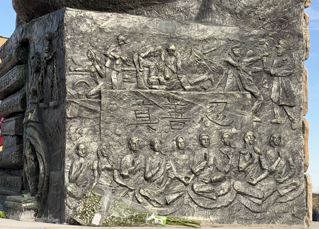 2026年4月4日,二百多位嘉賓雲集南加州自由雕塑公園,出席中國人權律師高智晟塑像揭幕儀式。圖為高智晟律師塑像側面的浮雕。(陳德怡/大紀元)