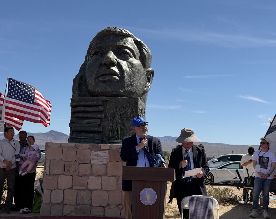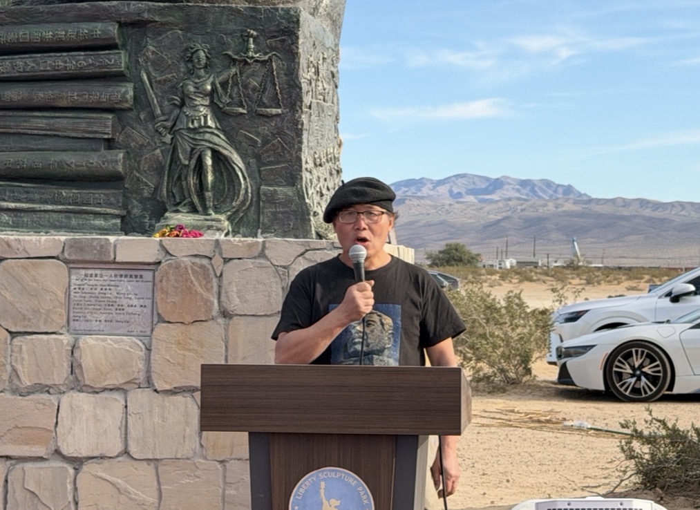 2026年4月4日,二百多位嘉賓雲集南加州自由雕塑公園,出席中國人權律師高智晟塑像揭幕儀式。六四屠殺親歷者方政發言。(陳德怡/大紀元)