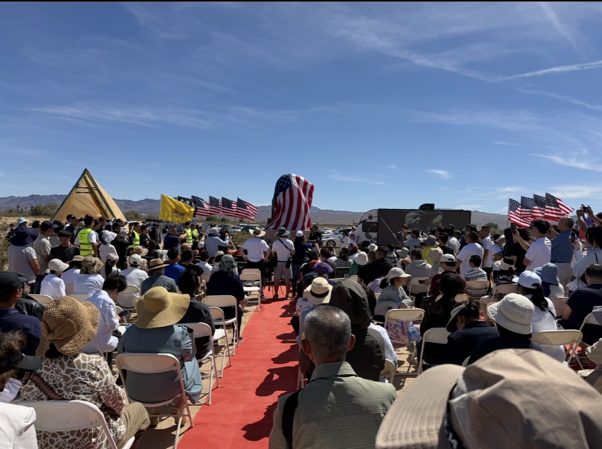 2026年4月4日,二百多位嘉賓雲集南加州自由雕塑公園,出席中國人權律師高智晟塑像揭幕儀式。加州州長參選人福音派韓裔牧師祈安(Ché Ahn)發言。(陳德怡/大紀元)