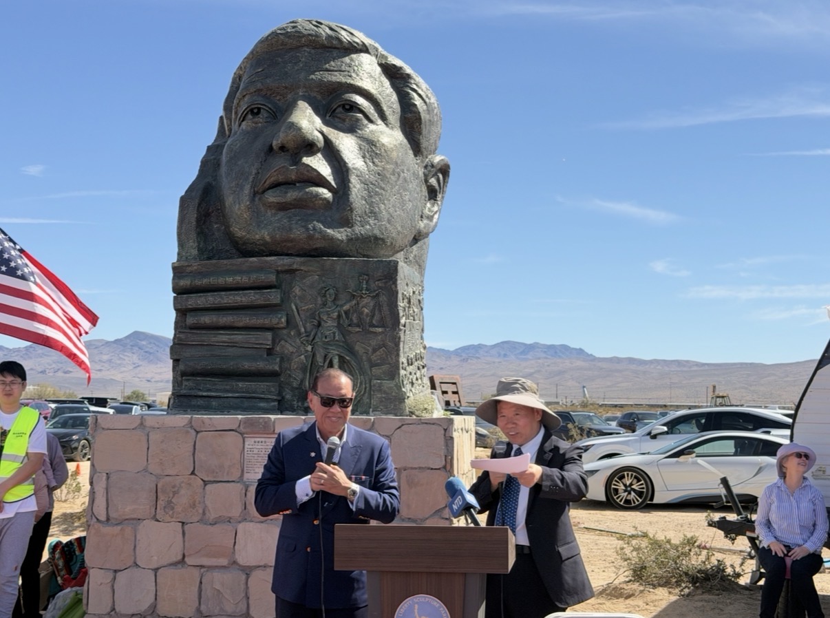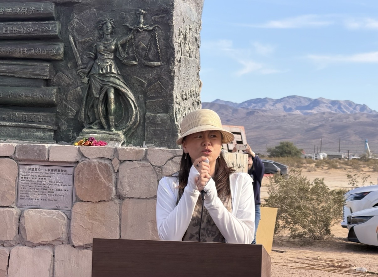 2026年4月4日,二百多位嘉賓雲集南加州自由雕塑公園,出席中國人權律師高智晟塑像揭幕儀式。自由雕塑公園和中國民主教育基金會理事鄭雲發言。(陳德怡/大紀元)