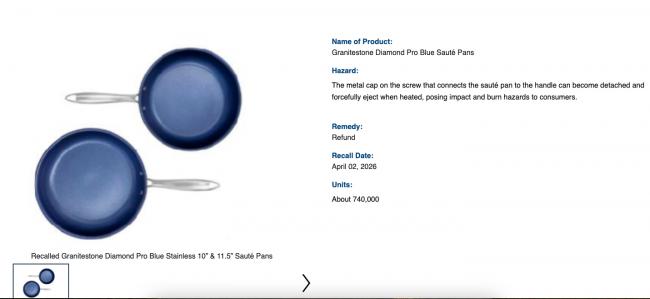 根據美國消費品安全委員會(CPSC)發佈的公告,E Mishan從4月2日起召回約74萬個中國製造Granitestone Diamond Pro Blue不鏽鋼平底鍋,原因是存在燙傷風險。被召回產品曾通過Costco(好市多)實體店和沃爾瑪網站等渠道出售。