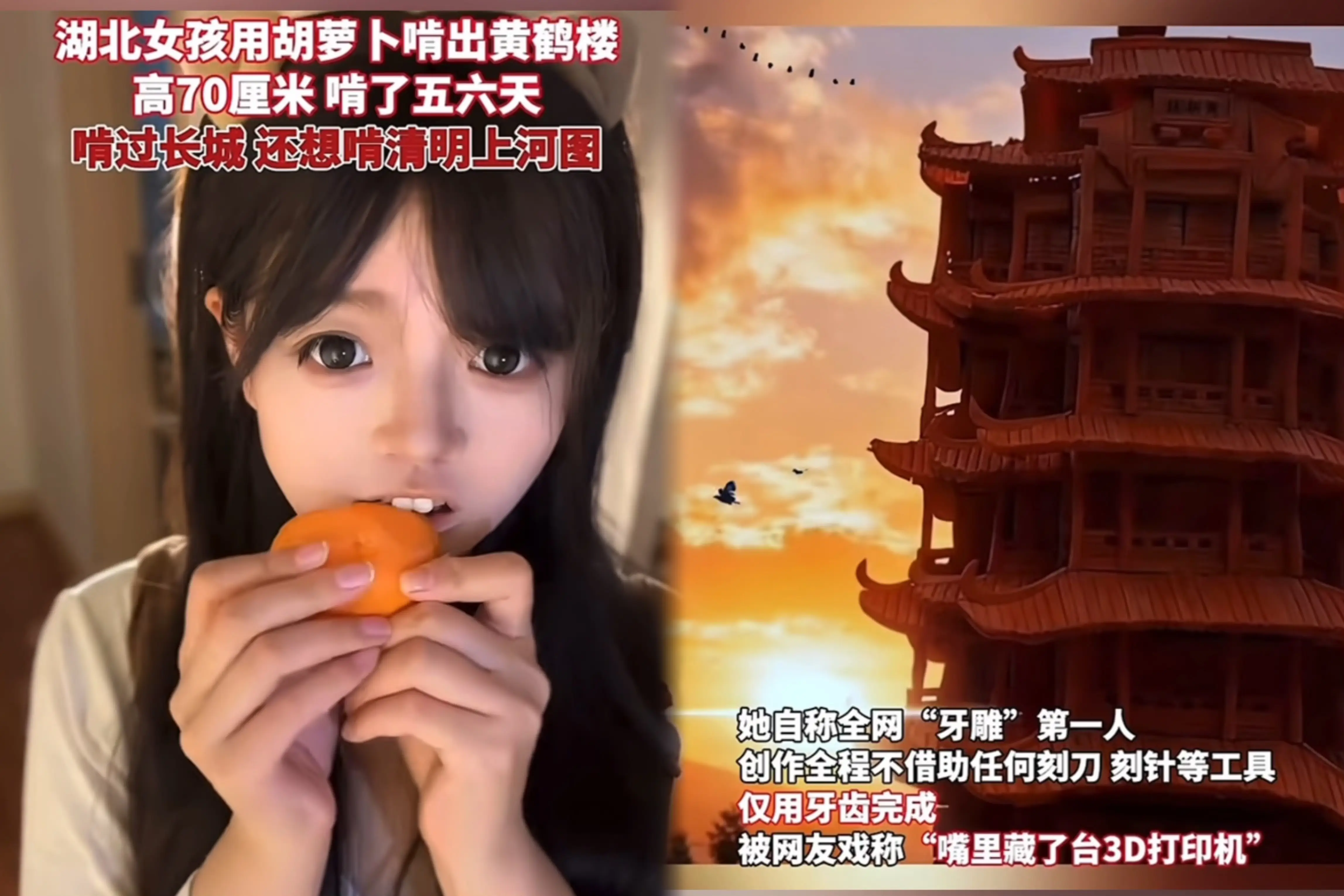 後來有一次,她閒着沒事拿胡蘿蔔啃着玩,竟然啃出了形狀!她來了興致,啃出了一座70厘米高的黃鶴樓、長城、中國結、鏤空鎖鏈,樣樣逼真。