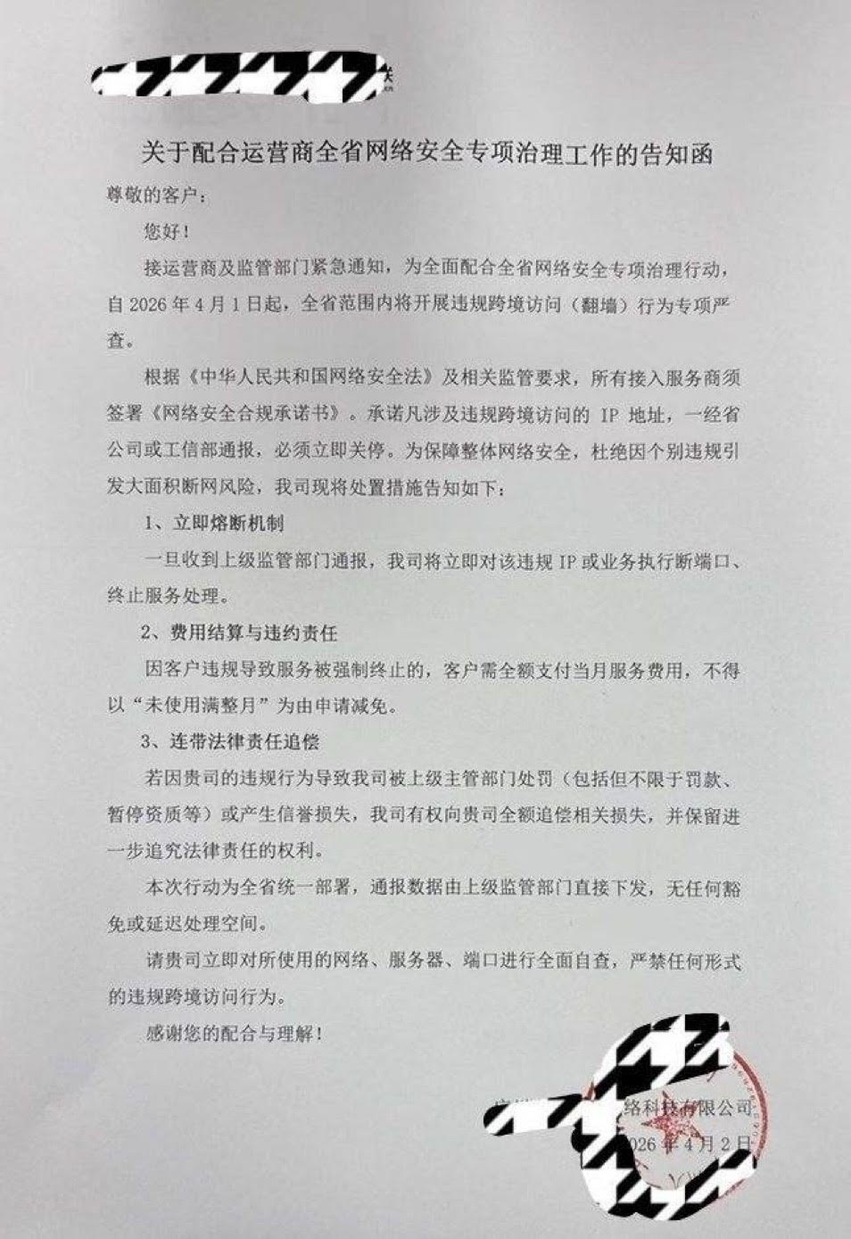 流出的多份未打碼文件顯示,該文件與一家總部位於江蘇蘇州的IDC服務商發佈內容一致。公開資料顯示,該公司主要從事伺服器託管、雲計算及網絡接入業務,客戶涵蓋電商、外貿企業及互聯網平台。業內人士指出,這類企業位於網絡鏈條的關鍵節點,一旦執行指令,將直接掐斷大量終端用戶的境外連線。