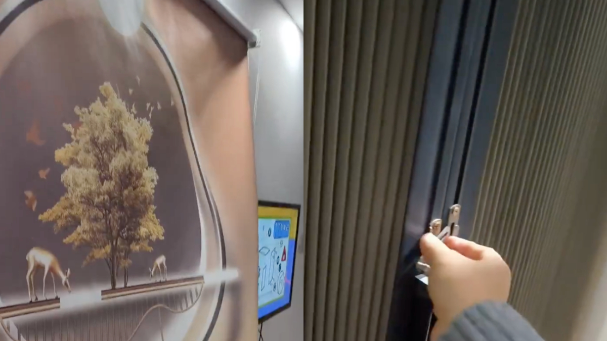 2026年4月5日,湖北一女子入住一家酒店,意外發現房間掛的裝飾畫後面還有一個門,而且是紙做的,打開的瞬間嚇了一跳。(視頻截圖合成)