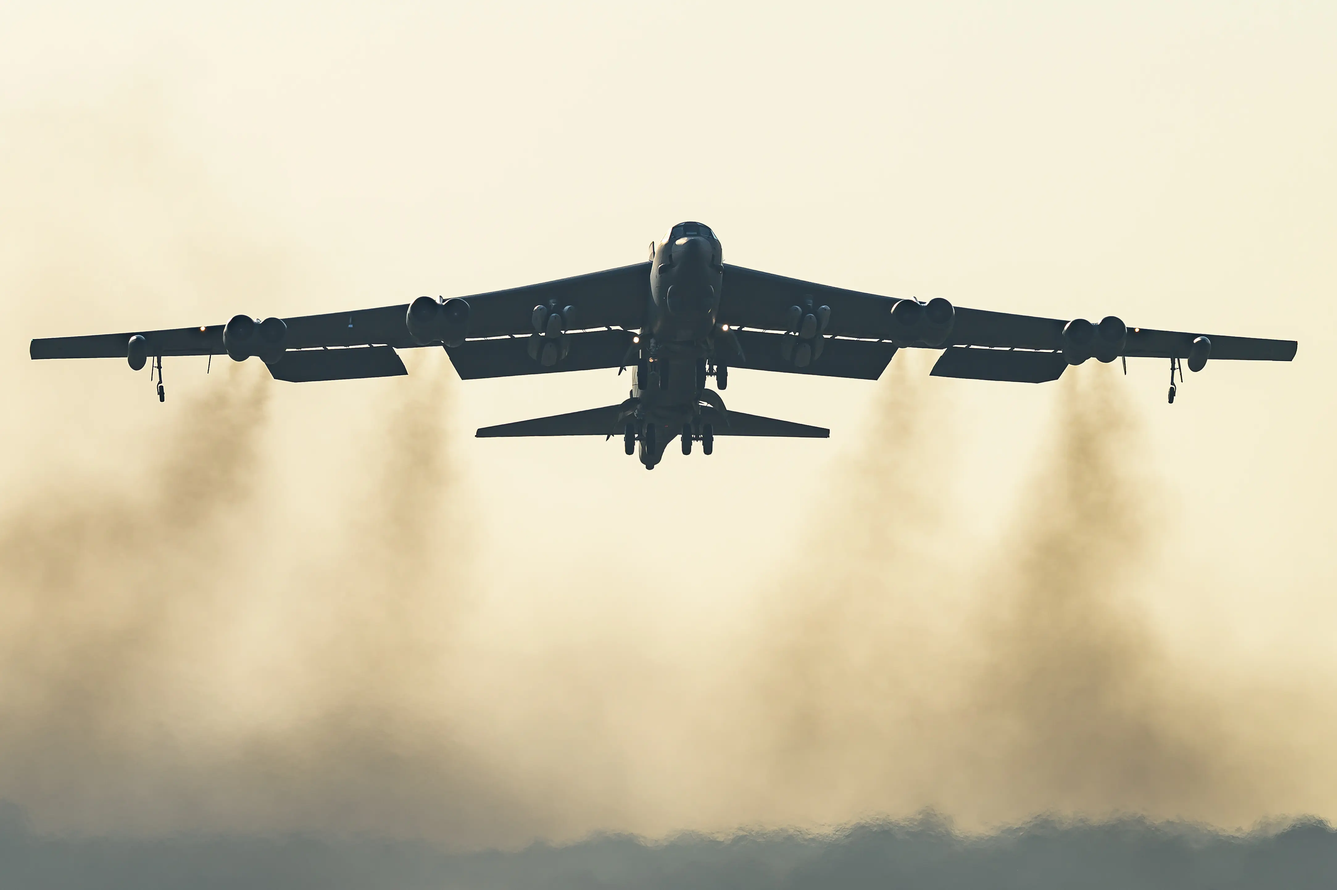 圖為2026年3月19日,在英國費爾福德(Fairford),美國空軍一架B-52「同溫層堡壘」(Stratofortress)戰略轟炸機從費爾福德王家空軍基地(RAF Fairford)起飛,執行針對伊朗深層打擊任務。(Leon Neal/Getty Images)