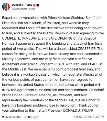 川普最新在Truth Social上發文稱:「基於與巴基斯坦總理謝里夫和巴基斯坦陸軍元帥阿西姆·穆尼爾的會談,他們請求我今晚不要向伊朗部署破壞性力量,並且以伊朗同意完全、立即且安全地開放霍爾木茲海峽為前提條件,我同意暫停對伊朗的轟炸和攻擊,為期兩周。這將是一項雙向停火!這樣做的原因是,我們已經達到甚至超越了所有軍事目標,並且在與伊朗達成長期和平協議以及中東和平協議方面取得了重大進展。我們收到了伊朗提出的十點建議,並認為這是一個可行的談判基礎。美國和伊朗之間幾乎所有過去的爭議點都已達成一致,兩周的時間將使協議得以最終敲定和生效。作為美國總統以及代表中東各國,我非常榮幸能在這個長期問題的解決上取得進展。」