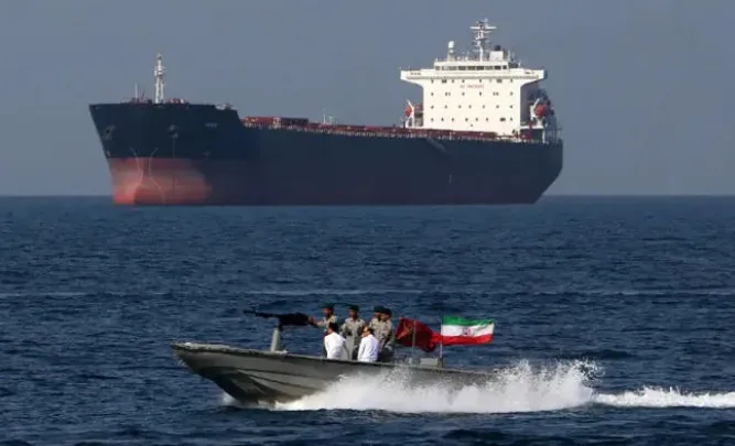 一艘伊朗革命衛隊的快艇在霍爾木茲海峽經過一艘油輪。圖:翻攝自鳳凰網