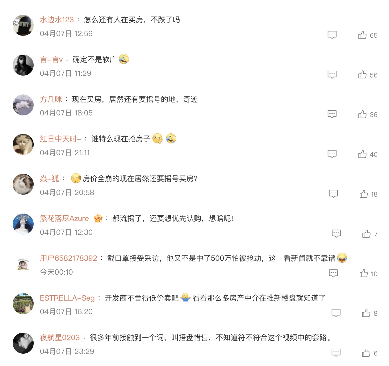 也有網友分析,現在,房價不斷下滑,沒人敢購房,此報導不得不讓人懷疑是促銷廣告,「怎麼還有人在買房,不跌了嗎」「房價全崩的現在居然還要搖號買房?」「一人搖號,次日清盤——這速度,怕是連印售樓合同都來不及吧?」「確定不是軟廣告?」。