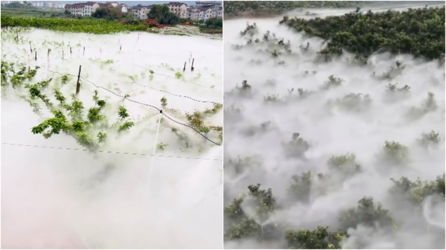 視頻顯示,桃園內白霧繚繞,綠樹若隱若現,看起來很象《西遊記》電視劇中的「蟠桃園仙境」。但許多網民提醒,這片「美麗的白霧」其實是劇毒的農藥。