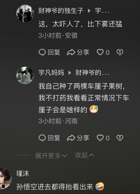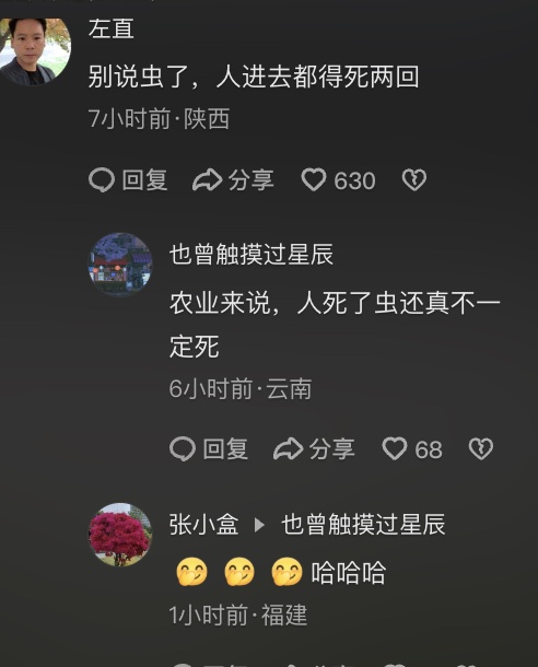 網友紛紛留言調侃:「這,太嚇人了,比下霧還猛」「別說蟲了,人進去都得死兩回」「孫悟空進去都得抬着出來」。