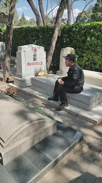 八寶山今年又有改觀,出口內修了一個大停車場,解決了停車難。墓地區除了幾年前安裝的水池水管,還準備了掃帚和水桶墩布。我和兒子給父母的陵墓清掃完畢之後。正準備去北院祭奠何家棟先生,這時走進墓園一個端著盒飯的保安,就坐在和我父母相鄰的陵墓上,打開菜盒,吃起饅頭。我說他:「你怎麼能坐在人家陵墓上?」他理都不理,繼續吃。