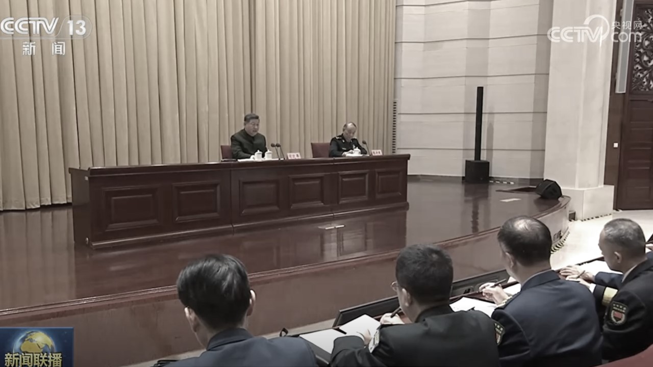 中共黨魁習近平2026年4月8日出席全軍高級幹部培訓班開班式,僅三名上將陪同參加。圖為習近平與軍委副主席張升民兩人坐在主席台上。(視頻截圖)