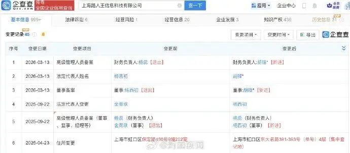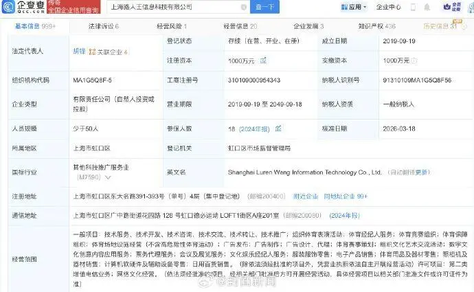 企查查App顯示,「路人王」運營公司上海路人王信息科技有限公司成立於2019年9月,註冊資本1000萬元,經營範圍含體育經紀人服務、體育競賽組織、體育保障組織等。2026年3月,該公司法定代表人、董事、財務負責人均發生變更。